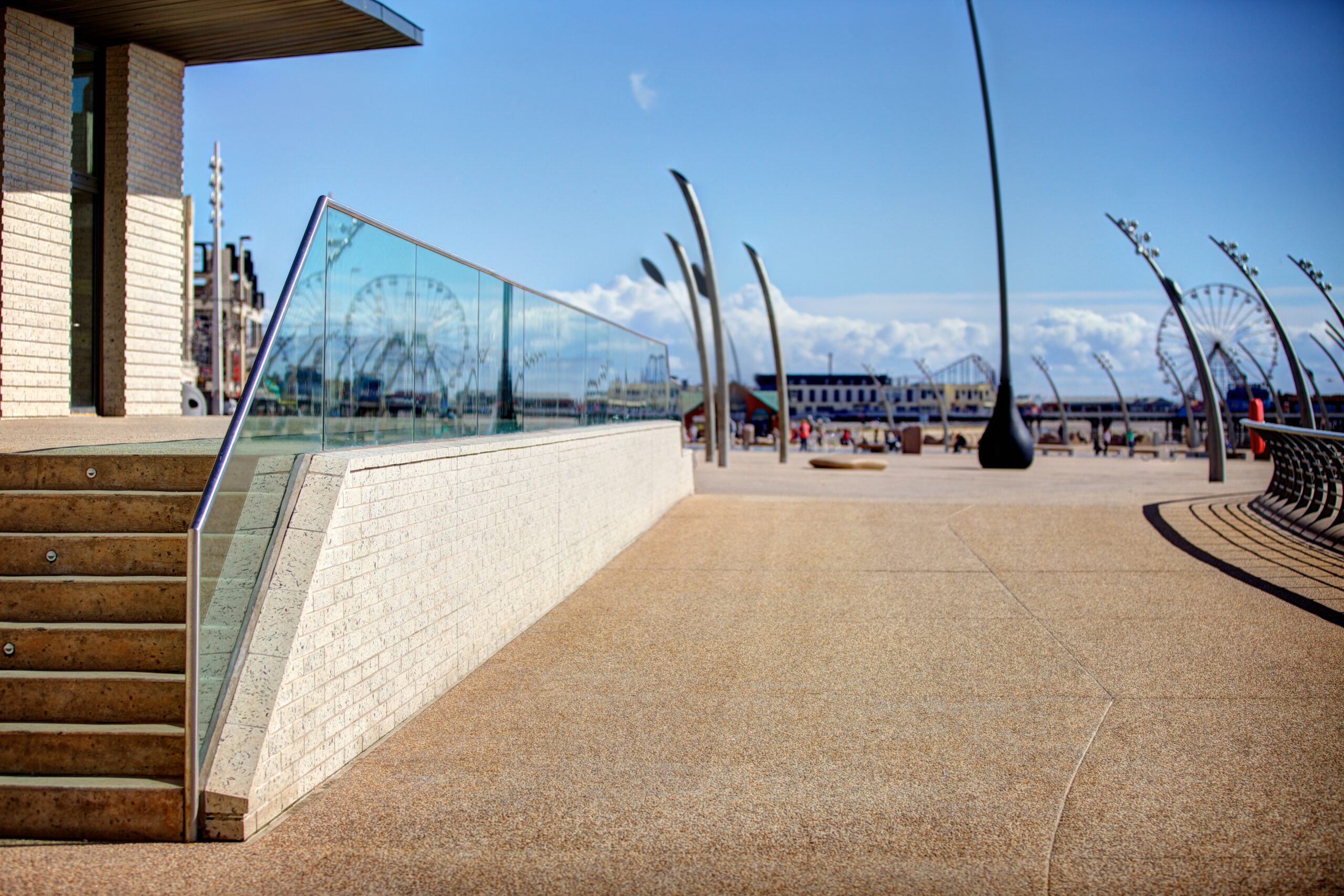 Now a key to the character of Blackpool’s promenade, the Tower of Love Pavilion building is constructed with a clever blend of materials such as; engineered timber, stepped concrete plinth containing recycled and phosphorescent glass, golden stainless-steel shingles, all making the perfect setting for some frameless glass balustrade.